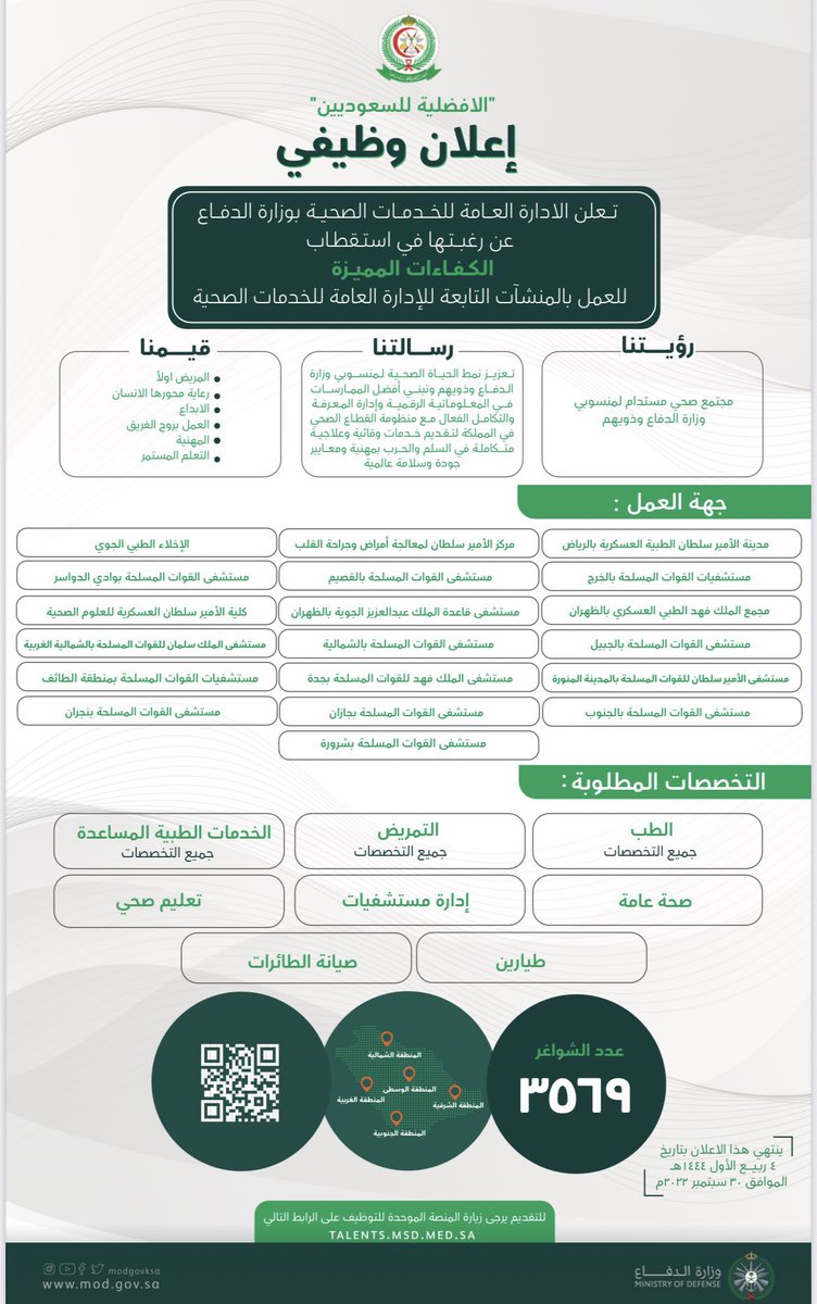 أعلنت وزارة الدفاع توفر عدد 2181 وظيفة صحية بمستشفياتها في مختلف التخصصات ومنها " #الطب و #التمريض والخدمات الطبية المساعدة "