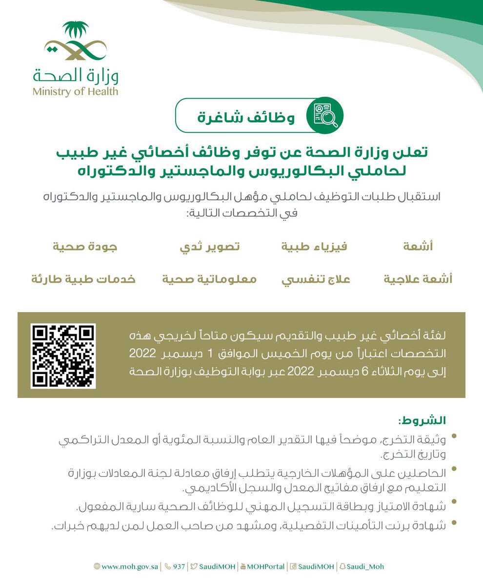 أعلنت وزارة #الصحة عن توفر وظائف "اخصائي غير طبيب" في مختلف التخصصات "أشعة - فيزياء طبية - جودة صحية - علاج تنفسي - معلوماتية - خدمات طبية طارئة"