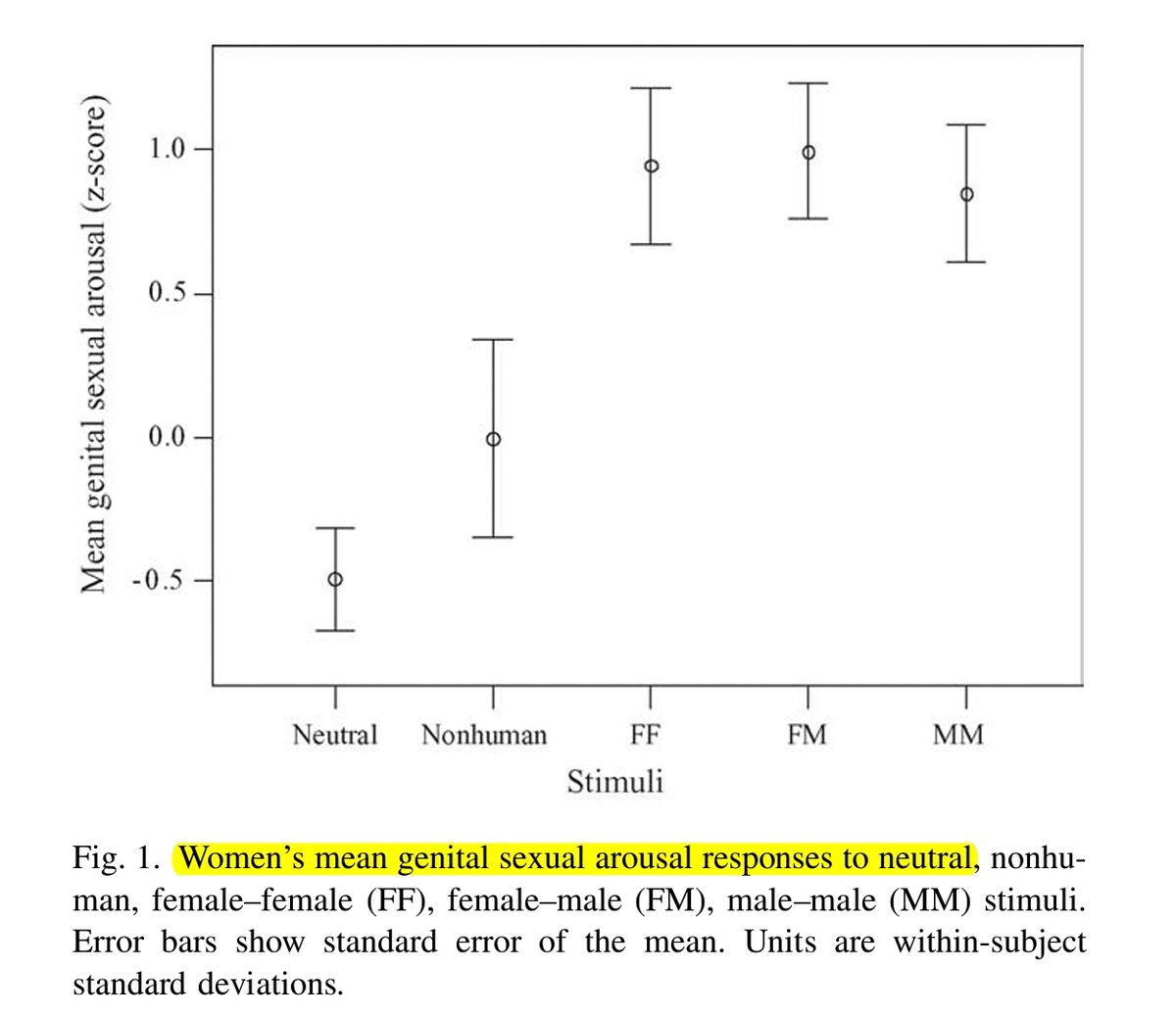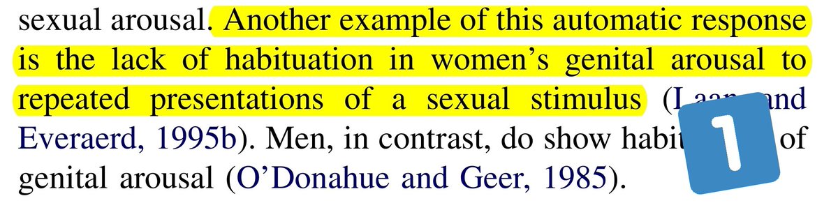 عند الإناث حصلت استجابة جسدية لجميع المقاطع بإستثناء مشهد الطبيعة ولكن الاستجابة النفسية حصلت لمقاطع الرجل مع الأنثى + بشكل أضعف مقاطع الأنثى مع الأنثى +اكثر ضعف لمقاطع الرجل مع الرجل.