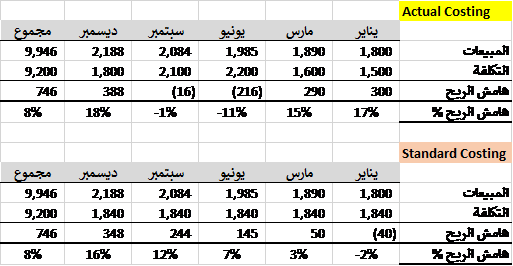فلذلك نستخدم هذه الطريقة ونبني تكلفة افتراضية بتحليل التكاليف التاريخية وتوقعات مستقبلية ولنقل أنها المتوسط 1840 ريال فلذلك التكلفة ستكون معتدلة على مدار السنة. في نهاية السنة هامش الربح كمبلغ ونسبة لم يتغير لكنك استطعت أن ترى الربحية بشكل متناسق ومقنع.