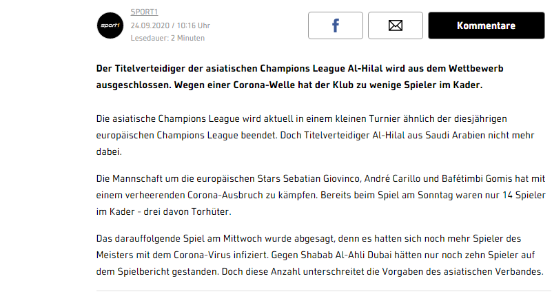🔵 صحيفة "sport1" الألمانية: استبعاد مرير لفريق #الهلال لأنه كان ضامن بالفعل تأهله من دور المجموعات دون أي مشاكل. تم استبعاد حامل لقب دوري أبطال آسيا من المنافسة بسبب فيروس كورونا،