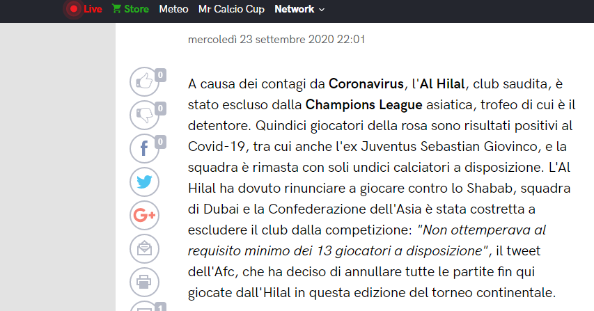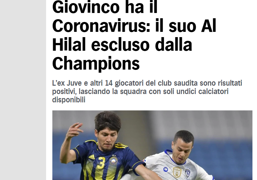🔵🔵 صحيفة "corrieredellosport" الإيطالية: جيوفينكو مصاب بفيروس كورونا. تم استبعاد فريقه #الهلال من دوري أبطال آسيا. لم يتبق للفريق سوى أحد عشر لاعباً وتم إبعاد حامل اللقب بقرار متعنت من الاتحاد الآسيوي.