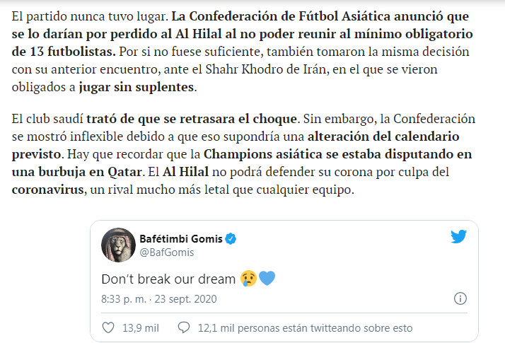 🔵 صحيفة "elmundo" الأسبانية: إبعاد #الهلال من دوري أبطال آسيا. أعلن الاتحاد الآسيوي استبعاد النادي السعودي، الفائز الأخير بدوري أبطال آسيا، من بطولة هذا العام لعدم بلوغه الحد الأدنى البالغ 13 لاعباً في مباراة شباب أهلي دبي، بعد تسجيله عدة إصابات بفيروس كورونا.