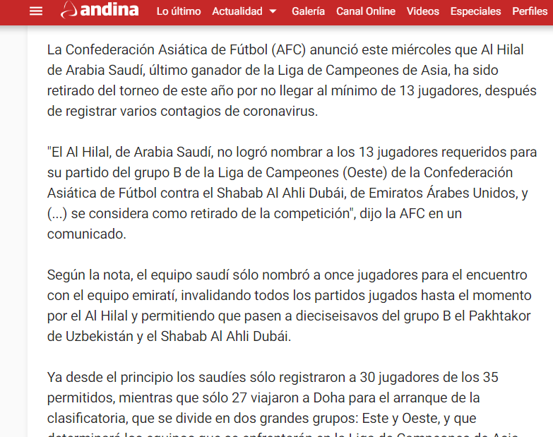 🔵 صحيفة "andina" البيروفية: قرار مُتعنت من الاتحاد الآسيوي باستبعاد #الهلال من دوري الأبطال. الفريق السعودي طلب تأجيل مواجهته مع شباب أهلي دبي بسبب ظروف قهرية، يُسمح بذلك في حالات استثنائية، لكن تم الرفض من اتحاد الكرة الآسيوي وتم إبعاد حامل اللقب من المسابقة.