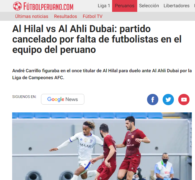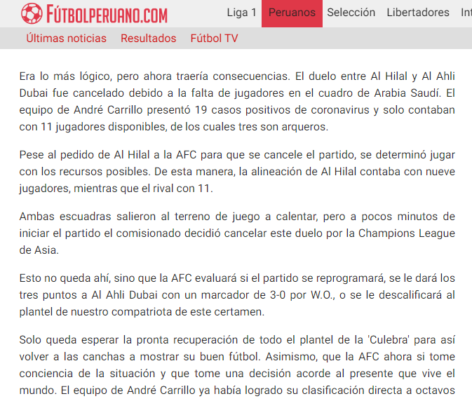 🔵 صحيفة "record" المكسيكية: إبعاد #الهلال من دوري أبطال آسيا وحرمانه من الدفاع عن لقبه. يستمر فيروس كورونا في إحداث فوضى في كرة القدم، حيث تم إقصاء الفريق السعودي من المسابقة لعدم استكماله الحد الأدنى من عدد اللاعبين المطلوب في مباراة شباب أهلي دبي الإماراتي.