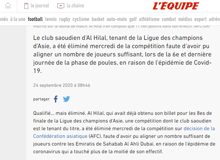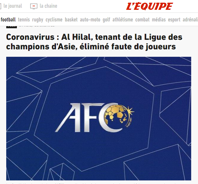 🔵 صحيفة "lequipe" الفرنسية: القضاء على #الهلال حامل لقب دوري أبطال آسيا لعدم قدرته على إشراك عدد كاف من اللاعبين خلال الجولة الأخيرة من دور المجموعات. الهلال كان مؤهل لدور الستة عشر وتم استبعاده. طلب الهلال التأجيل بسبب "الظروف الاستثنائية"، لكن الاتحاد الآسيوي رفض.