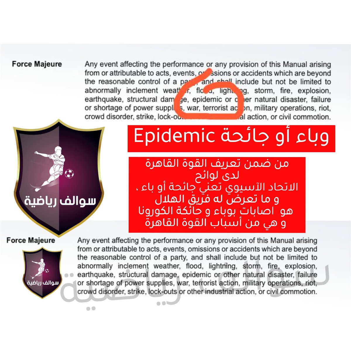و في تعريف (القوة القاهرة) في لوائح #الاتحاد_الاسيوي بأنه ما تعرض له #الهلال هو جائحة (وباء) #كورونا و هذا ما أكدته المنظمة الصحة العالمية بأن هذا المرض يعتبر وباء عالمي ، و هي أحدى حالات القوة القاهرة المنصوص عليها في لوائحهم ، و بالتالي هذه ظروف قاهرة.4️⃣