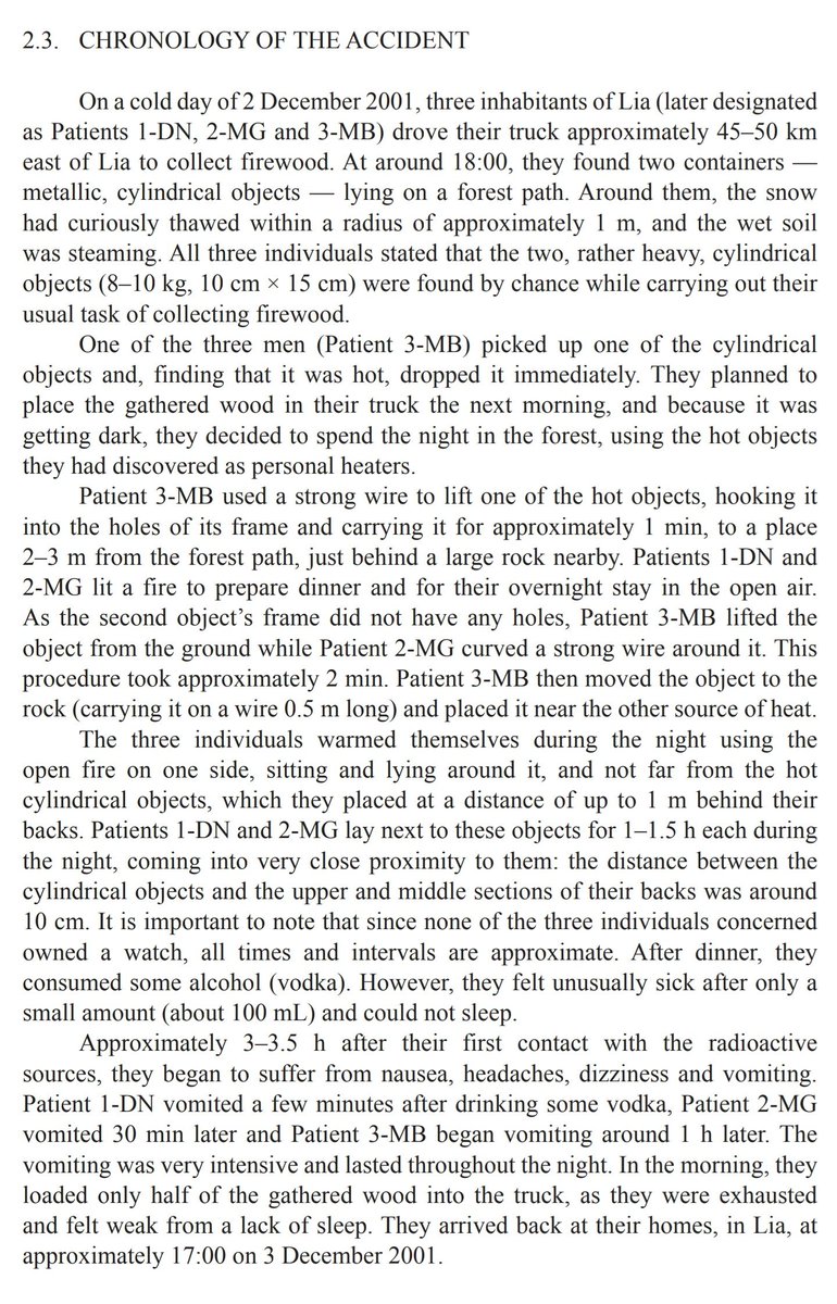 اختم القصة الغريبة و المخيفة، ان الاتحاد السوفيتي تعامل مع المواد الاشعاعية باستهتار اكثر من غيره فحادثة تشرنوبل اعظم من هذه القصة لكن المقصد، بقيت لهم مخلفات من ٢٠ سنة ظلت تشع ٢٠ سنة لاحقا و الله اعلم كم واحد اصيب قبل الثلاثة المساكين.