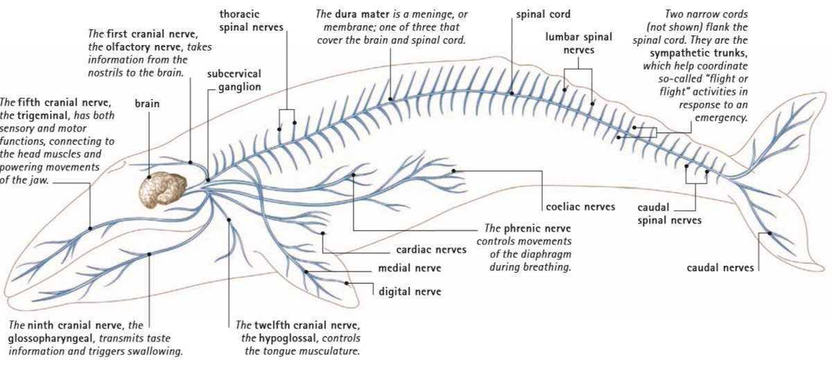 الجهاز العصبي يعتبر متقدم جدا زي القرود والانسان. والدماغ بنقسم لمخ ومخيخ. المخيخ مسؤول عن الحركة و التوزان و بالحيتان يعتبر متطور اكتر من المخيخ بالإنسان. لانو من اول ما ينولدو لازم يكون الحوت بعرف يسبح ويقدر يتحكم بجسمو على عكس الإنسان الي ما راح يقدر يمشي الا تقريبا قبل سنة.