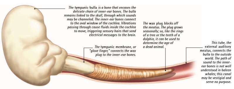 بس مثلا زي الحوت الاحدب بتنتقل الصوت جوا قناة الأذن للاذن الداخلية. بس في بالاذن اشي مميز الي هو سدادة شمعية بتساعد في نقل الصوت للداخل بالإضافة لحماية الأذن. وهاي السدادة بتكبر كل ما كبر الحوت بالعمر و نفس مبدأ الحلقات بساق الشجرة بنقدر نحدد عمر الحوت منها بس يموت.