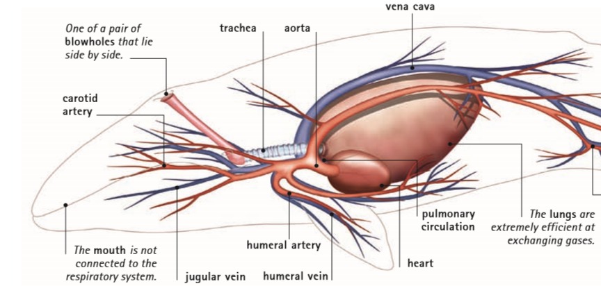 والحوت بتنفس 10-15 مرة على ثلاث دقائق قبل ما يغطس لاعماق. و بقدر يحبس نفسه اكتر من نص ساعة إذا كان في خطر ورئته احسن ب4 مرات من رئة الإنسان في امتصاص الأكسجين و بالاعماق بصير الأكسجين يروح من الأماكن الاقل أهمية للاهم زي الدماغ. لانو العضلات بتقدر تخزن أكسجين لوجود بروتينات خاصة.