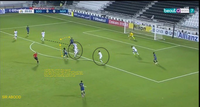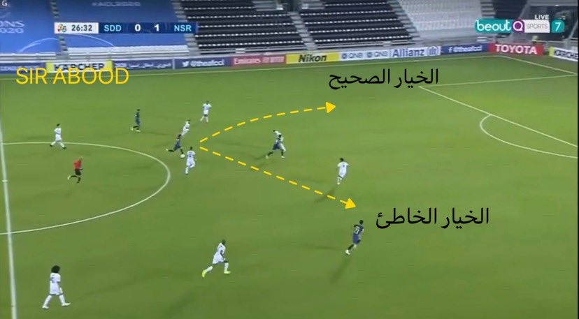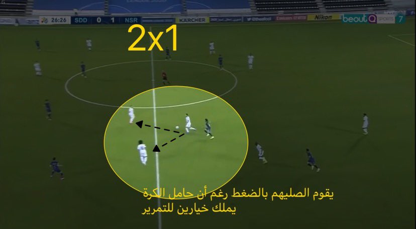🔹عامل الوقت هو من أفشل إتمام العملية، نجد أن الجزء من ثانية هي من غيرت مسار الهجمة، حيث نرى أن #الصليهم في الصورة رقم ٢ حركة جسده أصبحت غير متزنه مما صعب عليه تمرير الكرة، الصورة رقم ١ كان بالإمكان أن يمرر لكن كانت هناك نسبة أن يفقدها أدم أو تقل خطورة الهجمة لهذا فضل عدم تمريرها