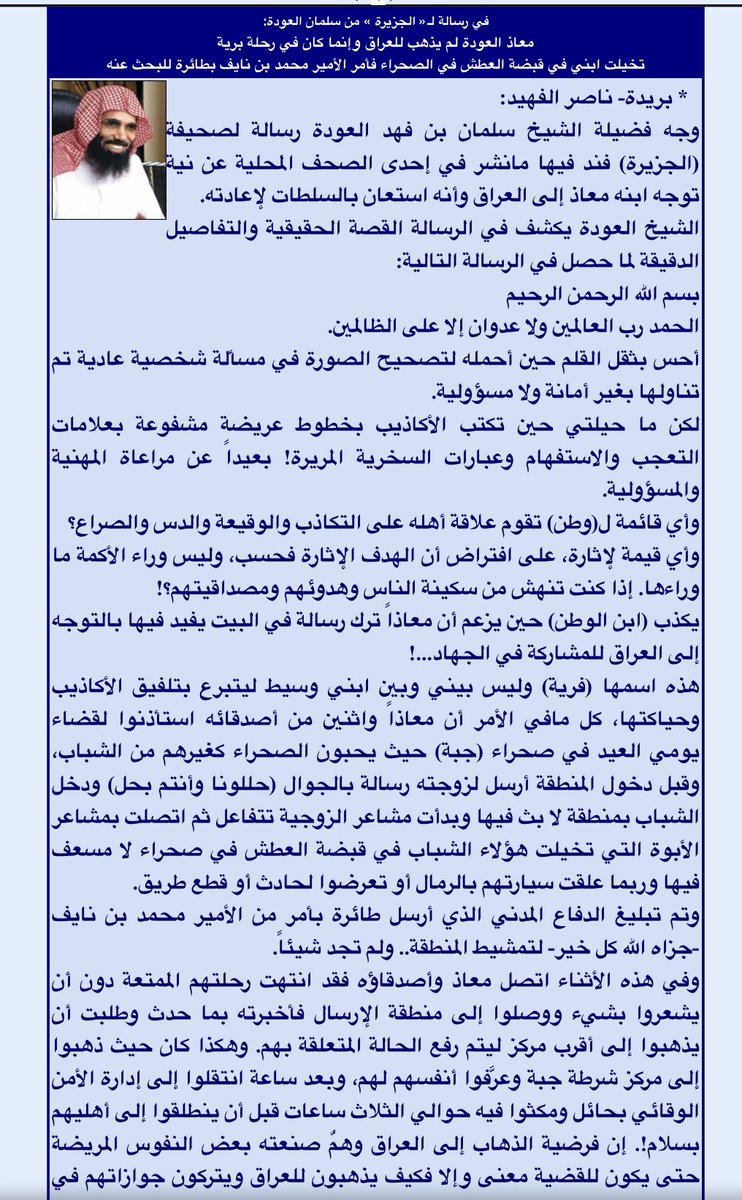 نشر العودة مقالاً طويلاً متشنجاً في صحيفة الجزيرة والقارئ بين السطور يلاحظ بأن العودة أكد التهمة التي ينفيها بلغته الإنفعالية ومقاله الطويل،المضحك أنه يقول في المقال(كيف يذهبون للعراق ويتركون جوازاتهم) وكأن الدخول #للعراق يتم بطريقة رسمية وبجوازات السفر!!