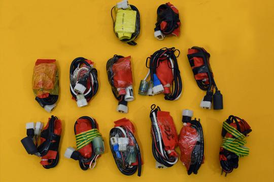 ضبط مجموعة كبيرة من المكثفات ومحولات كهربائية ومقاومات إليكترونية تستخدم في التشريك وتصنيع المتفجرات، عدد (5.28) كجم بارود ناعم وخشن، عدد (17) عبوة تحتوي على مواد كيميائية، عدد (13) جهاز إرسال واستقبال إشارات كهربائية، عدد (2) مفاتيح استقبال دائرة كهربائية..