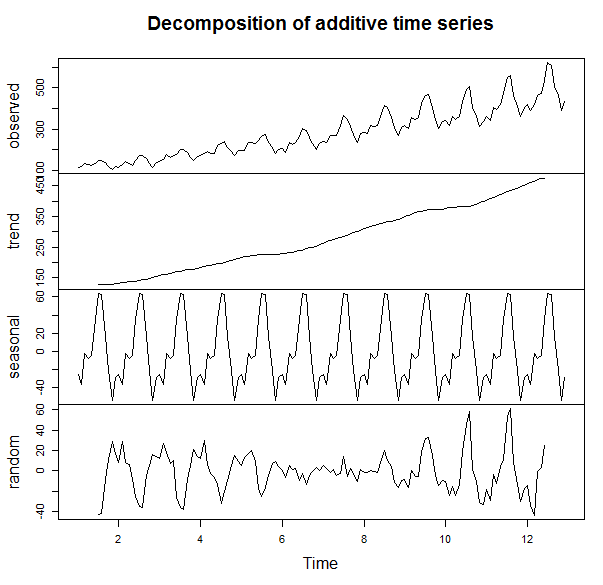 في الصورة نرى بالأعلى السلسلة الزمنية الأصلية ومن ثم تحتها ثلاث مكونات مستخرجة: اتجاه السلسلة، وتكرار موسميتها، والتأثيرات الخارجية، العشوائية على السلسلة الزمنية.