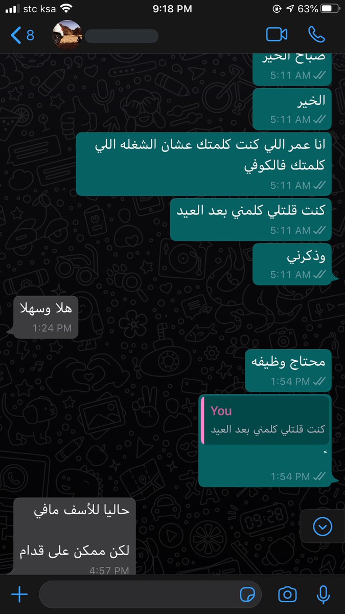 خرجت من الشركة عشان تأخير رواتبهم ووقفت ورجعت عاطل مره ثانية ورجعت مره ثانيه للعطالة وحرفياً قدمت على كل محل جات عيني عليه بقاله او عامل نظافه بكوفي مطاعم سوبر ماركت اي شي قدمت عليه وماصار لي نصيب بس صار لي موقف وقلت انو كل اللي صار لي هذا تمهيد من ربي على اللي حيصير بعدين