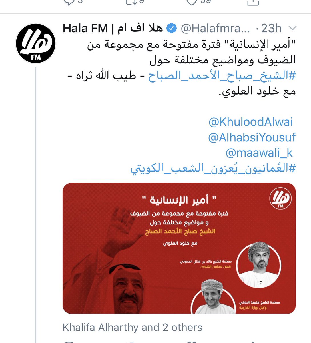٧- مسقط اف ام @RadioMuscat تفتح بثا إستثنائيا الآن وتستقبل من خلاله اتصالاً مستمراً مع أهلنا في الكويت ومع زملاء وإعلاميين كويتيين، لمشاركتهم هذا الحزن الكبير.