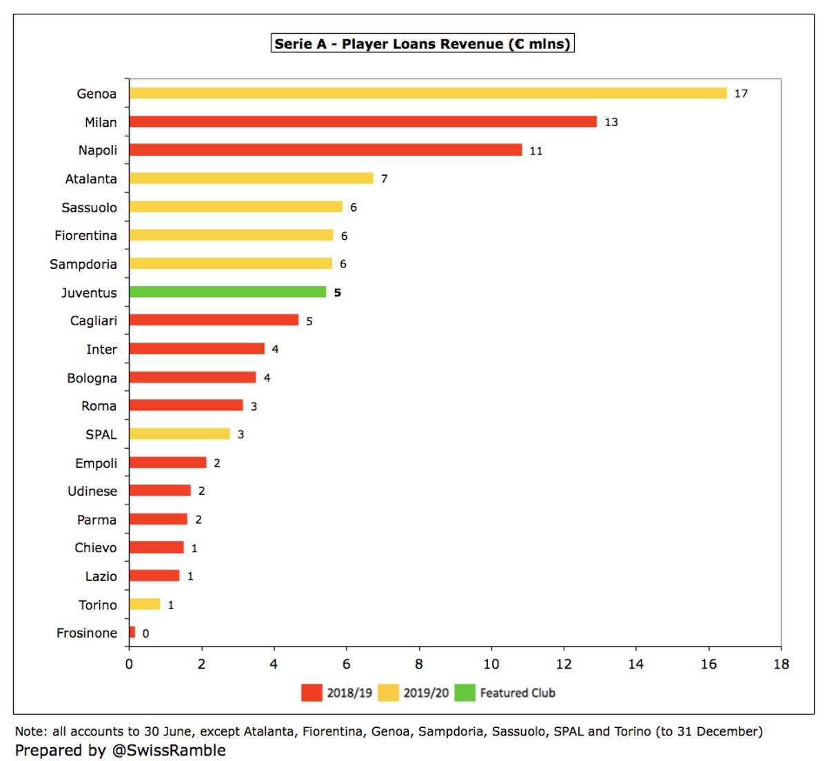 ايرادات يوفنتوس من الاعارات انخفضت من ٣٠م الى ٥م، السنة السابقة كانت الاعارات ضخمة حيث حصل يوفنتوس ١٨م من اعارة هيغوايين ( الميلان ١٠م، تشيلسي ٨م) و فافالي ٥م (جنوى)