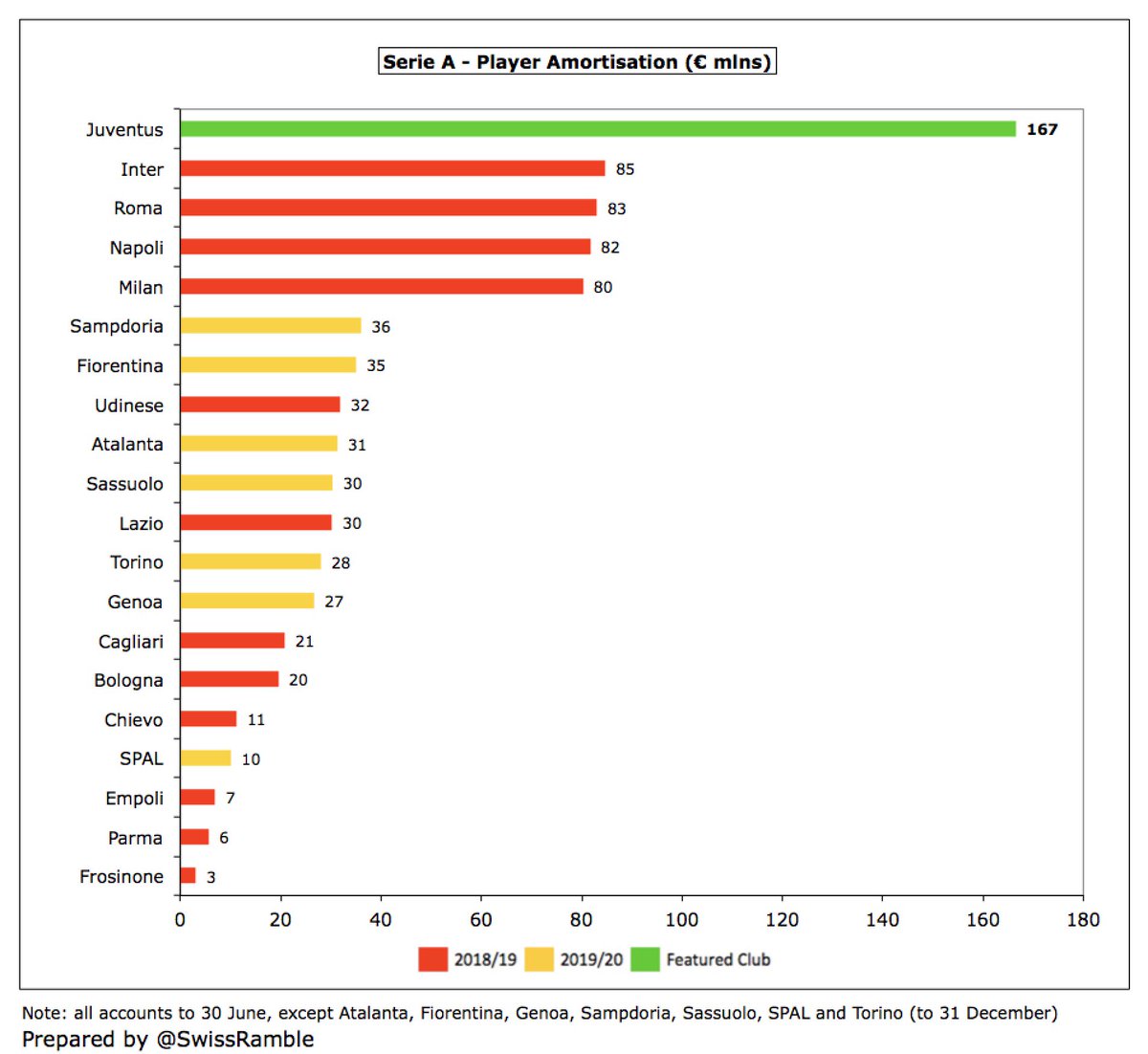 تكلفة قيمة إهلاك لاعبي يوفنتوس السنوية هي الأعلى في ايطاليا ١٦٧م يورو، تقريبا ضعف انتر ميلان ٨٥م و ميلان ٨٠م