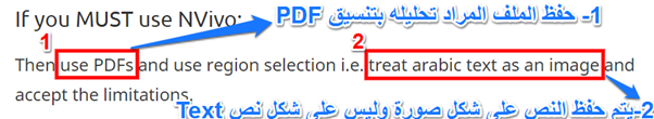 وينصح كاتب المقال الباحث الملزم في التعامل مع برنامج NVivo لتحليل النص العربي بحل لتجاوز هذه المشكلة عبر حفظ النص المراد تحليله كصورة بتنسيق PDF