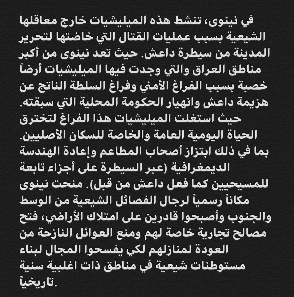 في أواخر شهر حزيران تحدث معي حول مشروع بحثي سري كان يعمل عليه لمدة ستة أشهر يرسم فيه خريطة تحالف الميليشيات الشيعية المعروفة بإسم الحشد الشعبي، 7️⃣