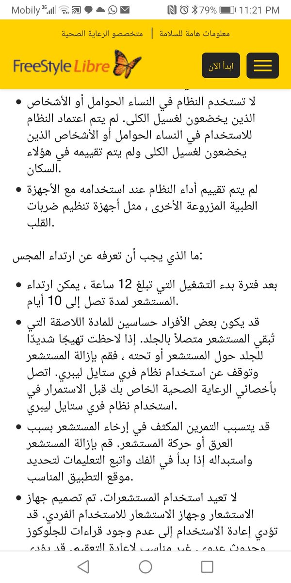دليل السلامة من موقع شركة أبوت الخاصة بالفريستايل ليبري ينصح بإزالة السنسر قبل عمل أشعة الرنين والأشعات بأشكالها لما لذلك من مضار على الحساس والمريض