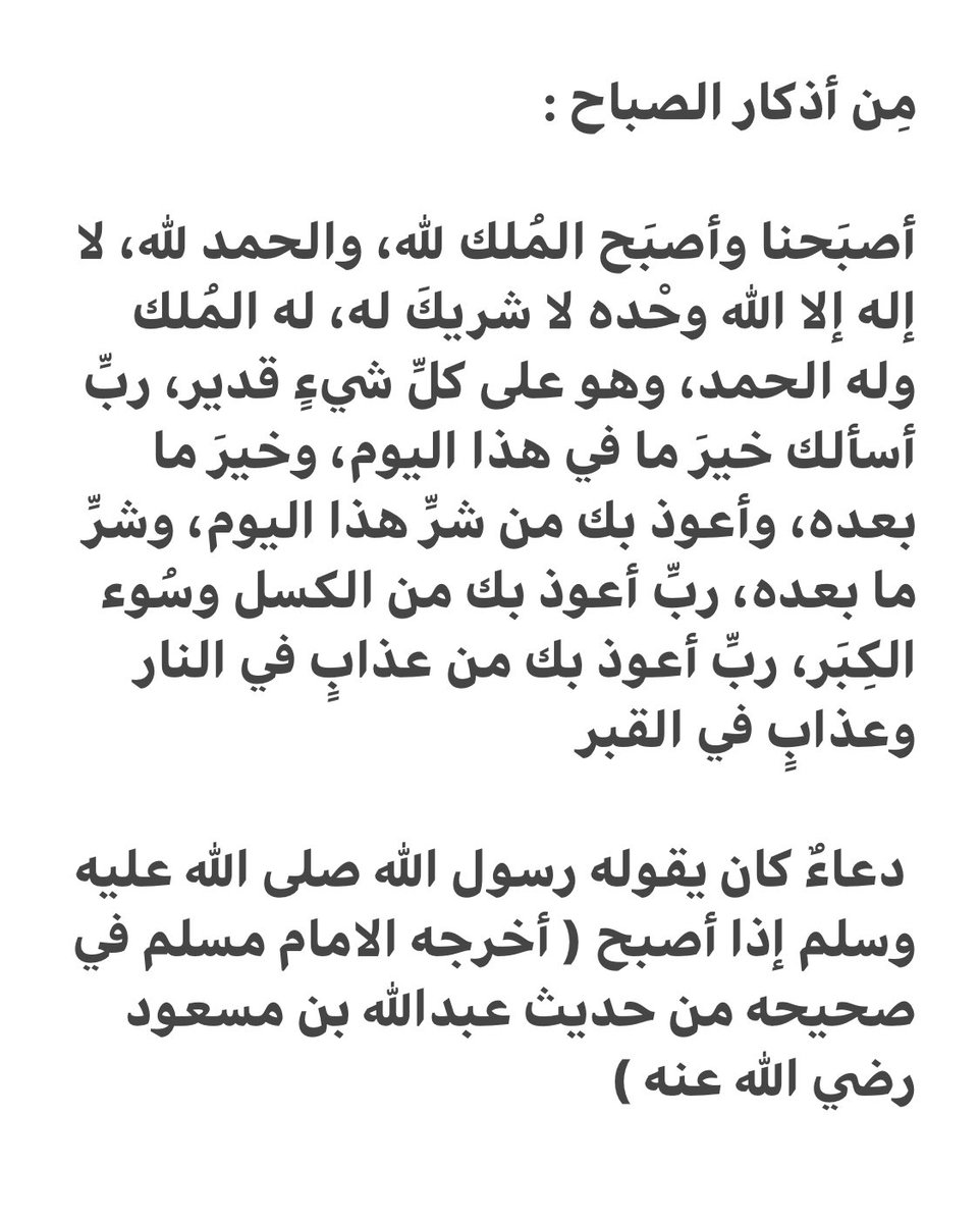 أصبحنا وأصبح الملك لله والحمد لله،لا إله إلّا الله وحده لا شريك له، له الملك وله الحمد وهو على كل شيء قدير،ربِ أسألك خير ما في هذا اليوم وخير ما بعده، وأعوذ بك من شر ما في هذه الليلة وشر ما بعدها، رب أعوذ بك من الكسل وسوء الكبر..الحديث(تكملته وتخريجه في المرفق)