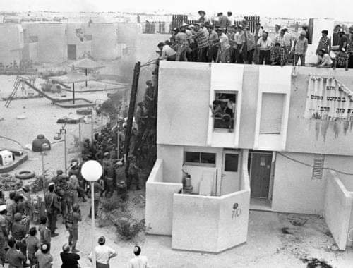 قرروا انهم يتحصنوا بالاسطح بتاعت بيوتهم رافضين الاخلاء مع كتابة عبارات سياسية رافضة للاخلاء ده، حاول جيشهم انه يجبرهم بالعصيان الحديد وهما لابسين خوذ وواقي للرصاص وحاولوا ينصبوا سلالم خشب عشان يطلعوا ينزلوهم بالعافية، لكن المعتصمين ولعوا نار في كاوتشات عربيات قديمة ورموها عليهم👇