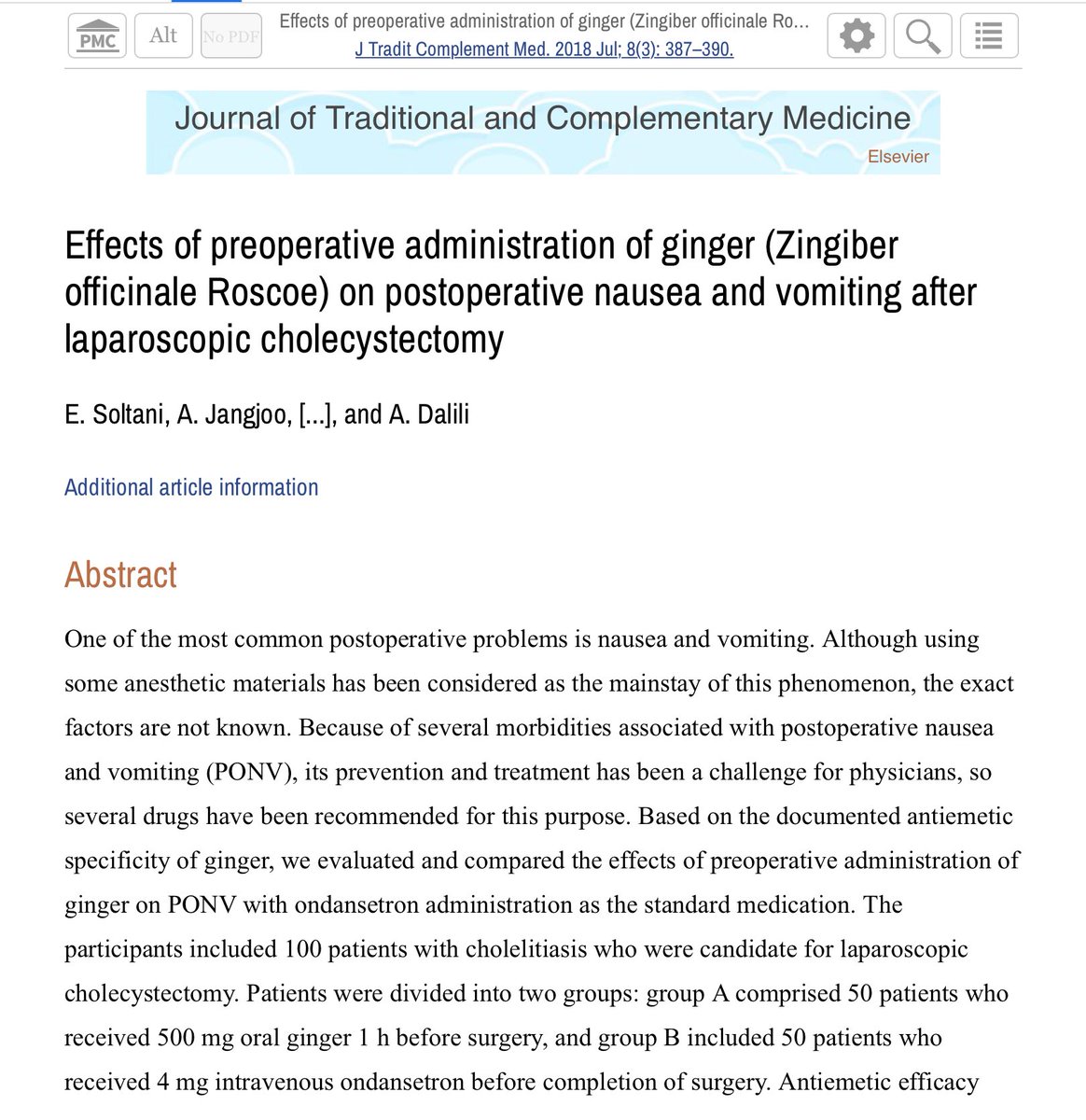 يبدو أن الزنجبيل فعال للغاية ضد الغثيان، فقد يساعد في تخفيف الغثيان للأشخاص الذين يخضعون لأنواع معينة من الجراحة، وأيضًا في الغثيان المرتبط بالعلاج الكيميائي وغثيان الصباح.