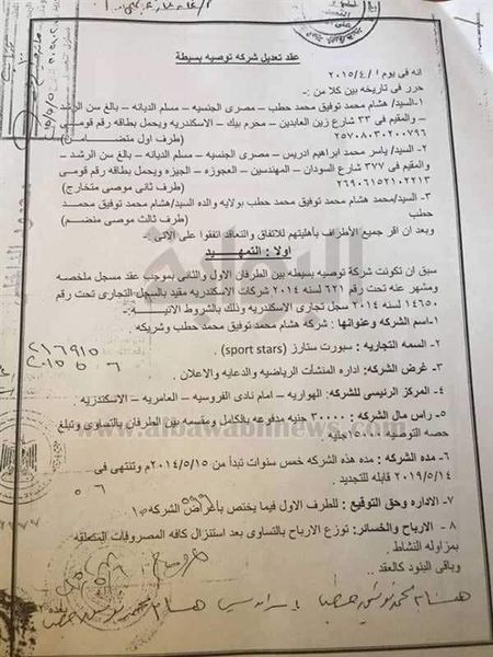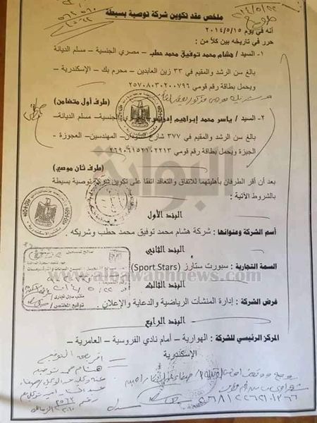 هشام محمد توفيق حطب وياسر محمد إبراهيم إدريس، وهي شركة "توصية بسيطة" سبورت ستارز لإدارة المنشآت الرياضية والدعاية والإعلان بالهوارية أمام نادي الفروسية العامرية بالإسكندرية برأسال مال 30 ألف جنيه كما ذكر في العقد أن الإدارة هي من حق حطب بينما توزع الأرباح بالتساوي.