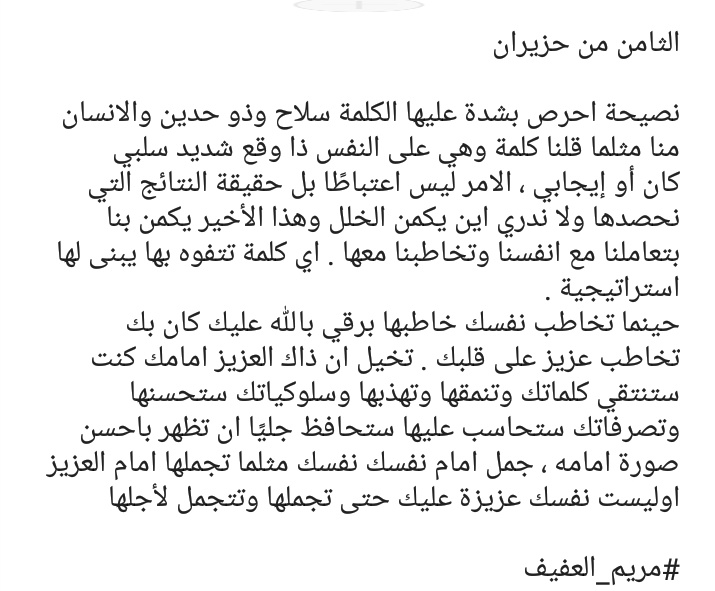 ، الآن لأجلي ولأجل كل ثوابتك ولأجل من يحبون حرفك وحضورك دونيها اليوم لا غدًا الآن الآن ، الله يراضيك عند كل وجع فيبدلك ملمح فَرح ، لنقل الحمد لله " .