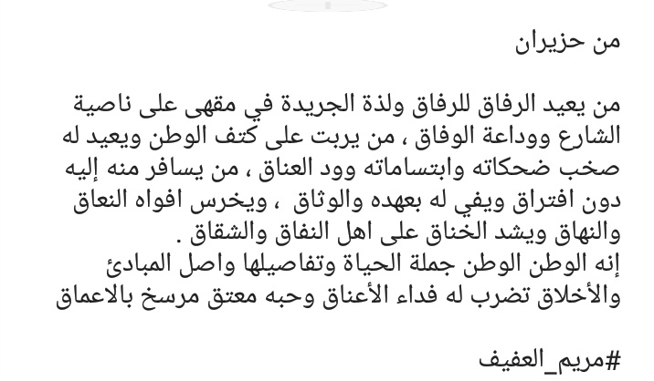:"مريم حبيبتي اعلم وجعك وبقدرحبك لي دوني كتاباتك بالورق ، أنتِ لا تجدين روحك الا بين رائحة الحبر العبق هناك فلاتهجريه حين يتعلق الأمر بخاصيتك ، الله يمنح كل امرء موهبة واحدة وانت لديك أكثر مما عند غيرك فلاتتركيها ، عرق عيني ياصغيرتي .... يتبع