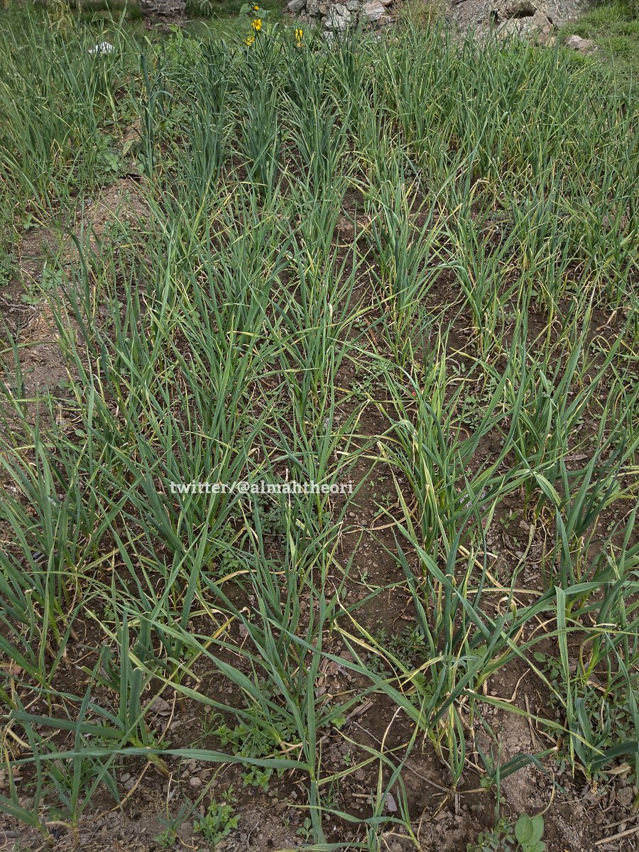 أو سماد أبقار وقليل من سماد الطيور في المناطق القليلة البرودة، يرجع السقي على نفس السابق لمدة اسبوعين حتى يبرد السماد بعدها يسقى كلما قلت رطوبة التربة، قلت الرطوبة وليس جفاف السطح لأن زيادة السقي يسبب تعفن الثوم بالفطريات، حتى بداية تشقق الأرض حوله والتي تدل على أن الثمار بدأت،
