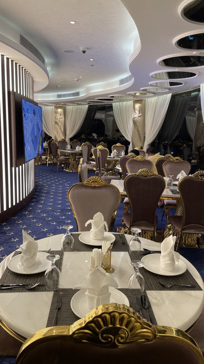موجود في أعلى المبنى بالدور ال 13 وتصميم المكان بشكل يخلي الارضية تتحرك و يدور المطعم بالكامل يعني يلف فيك وتتفرج على كل المنطقة المحيطة بالمطعم من اعلى البرج