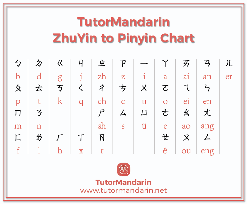 - لا توجد حروف في اللغة الصينية، بل تعتمد في الكتابة على الرموز. لكل كلمة رمز يدل في كثير من الأحيان على المعنى، نحو Tián 田 (حقل)، و Zhōn 中 (منتصف أو وسط).