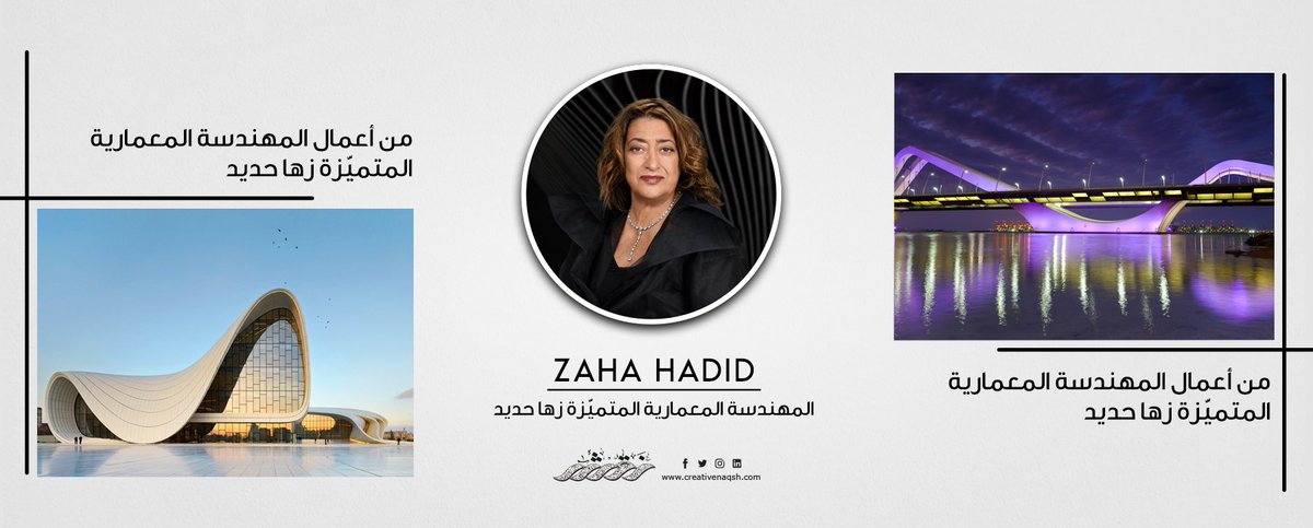 المهندسة المتميّزة زها حديد ولدت في 31 اكتوبر 1950 في بغداد ودرست الرياضيات في الجامعة الاميركية في بيروت ثم التحقت بالجمعية المعمارية في لندن وكانت أول امرأة تنال سنة 2004 جائزة "بريتزكر" التي تعد بمثابة "نوبل" الهندسة المعمارية