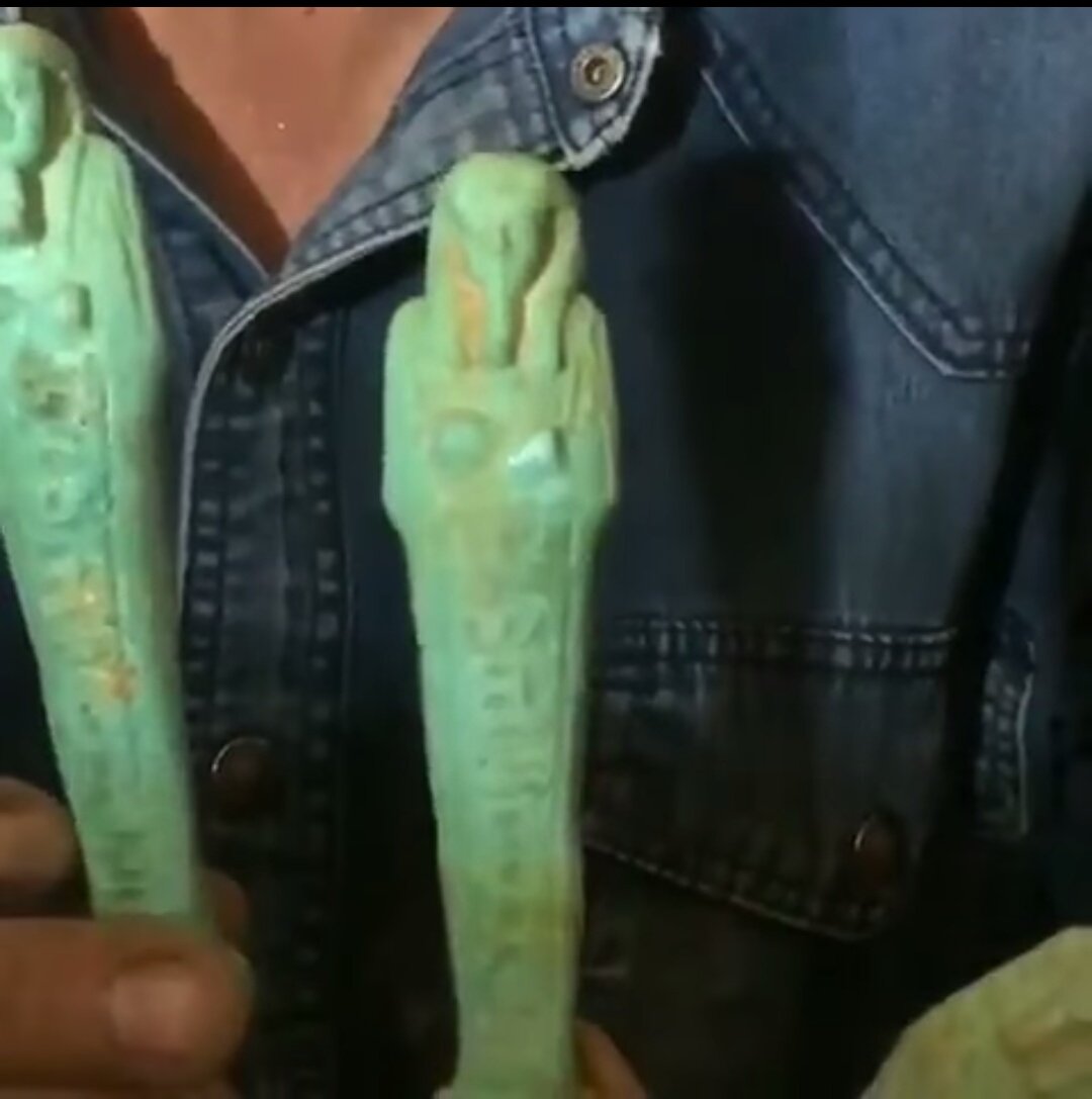 3-تم العثور أيضا على 400 تمثال أوشابتي من الفيانس الأزرق والأخضر تحمل اسم المتوفى و6 دفنات لأفراد عائلته بها ما يقرب من 1000 تمثال أوشابتى من الفيانس ومجموعات من الأواني الكانوبية مصنوعة من الألبستر والحجر الجيرى وبعض من التمائم والجعارين 👇