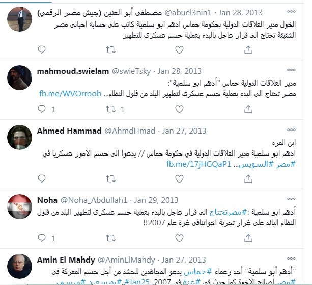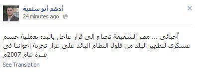 "مصر الشقيقة تحتاج إلى قرار حاسم بعملية حسم عسكري لتطهير البلد من فلول النظام البائد، على غرار تجربة إخواننا في غزة 2007" (1)