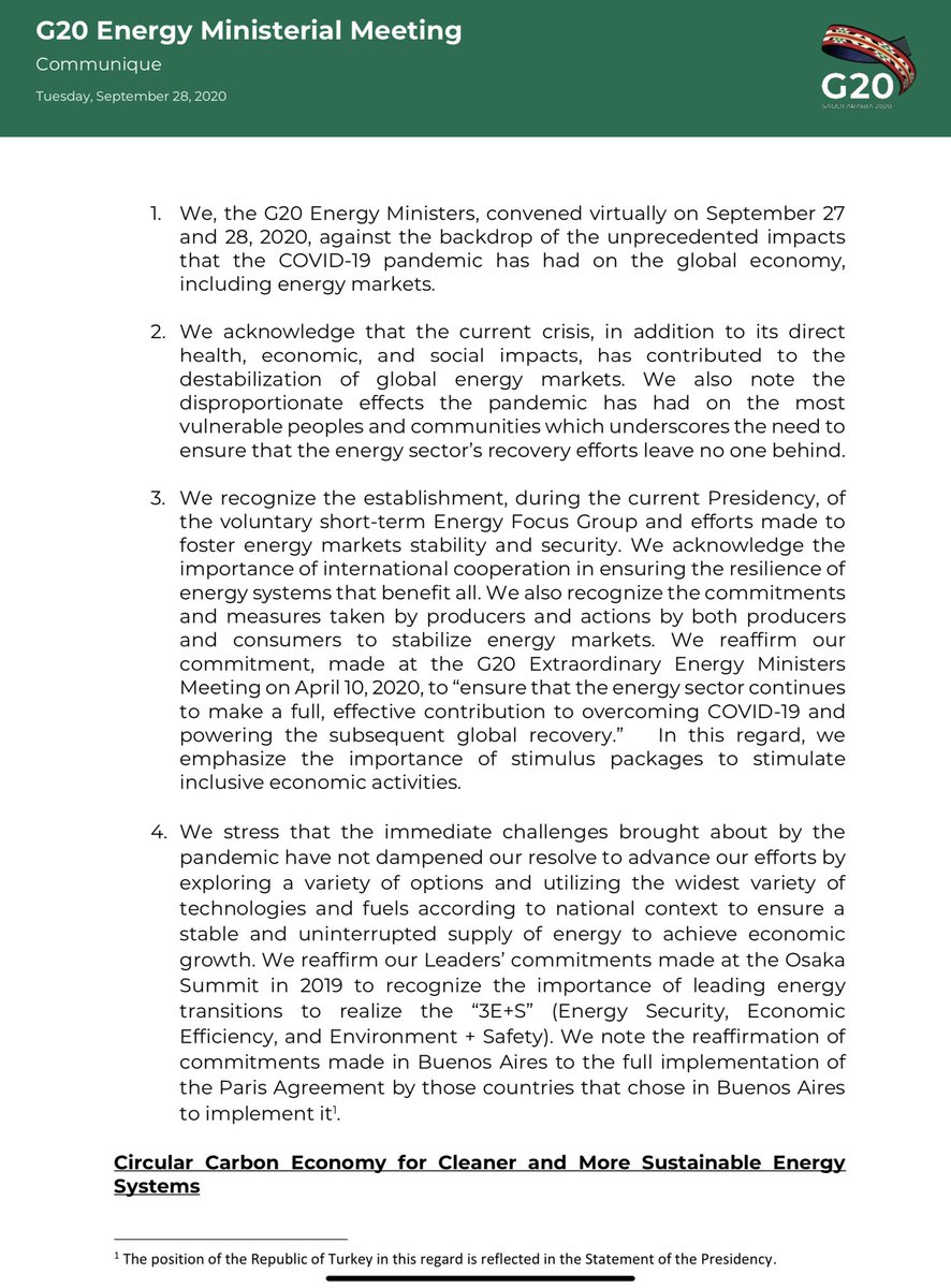 البيان الذي تبنى الإقتصاد الكربوني الدائري في اجتماع وزراء الطاقة لدول العشرين سيصنع من إطار العمل المستقبلي أكثر وضوحا و بعيدا عن تجاذبات الاجتهادات او المنظمات المنتشرة وهو يحتوي على برامج متعددة للدول الراغبة في الانخراط في العمل