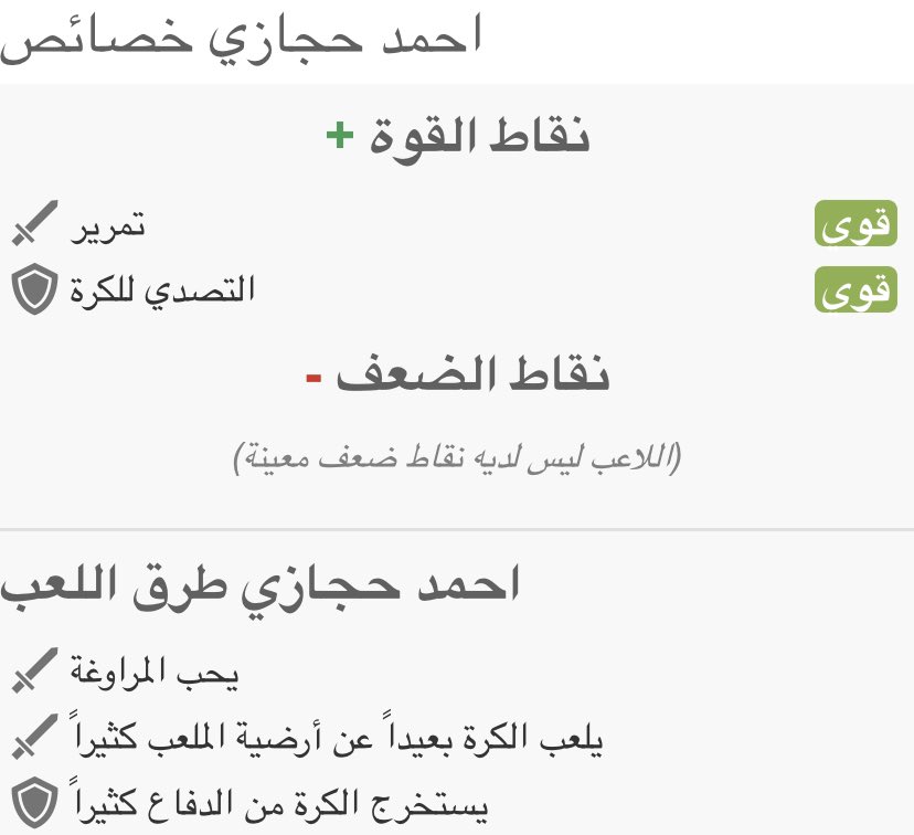 ▫️بالطبع لدى #احمد_حجازي مميزات كثيرة، لكن لا يوجد لاعب -كامل- لذلك المتابع لحجازي يدرك أن اللاعب -ثقيل حركيًا- نسبيًا لهذا لا تجده يحب أسلوب -الدفاع المتقدم- بسبب الثقل الذي يعود لوزنه ➕ طوله وهذا الأمر يعاني منه كثير من اللاعبين أصحاب الطول الفارع أمثال #مغواير على سبيل المثال
