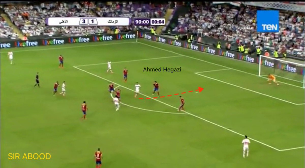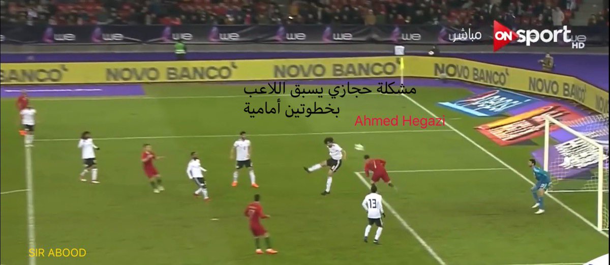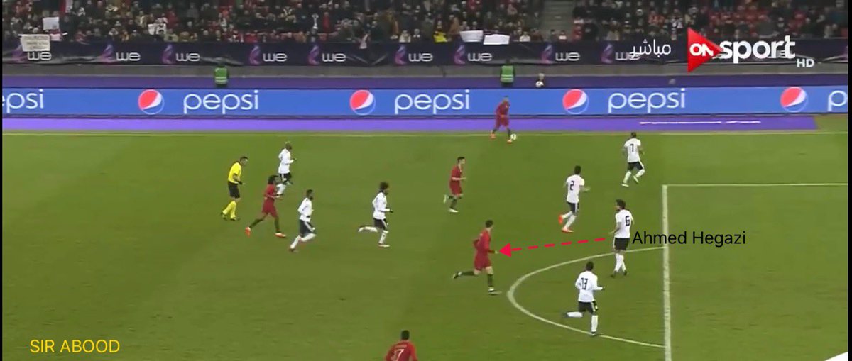 ▪️تكمن سلبية #أحمد_حجازي في التعامل السيء مع بعض الحالات -للكرات الطويلة- حيث تجده يتقدم خطوتين -حركة إستباقية- لكسب الكرة، وهذا يدخل فريقه في مواقف محرجة، #نشاهد أن #حجازي مدرك تمامًا مكان #رونالدو لكن قرر أن يكسب الكرة مبكرًا -مراهن على طوله-