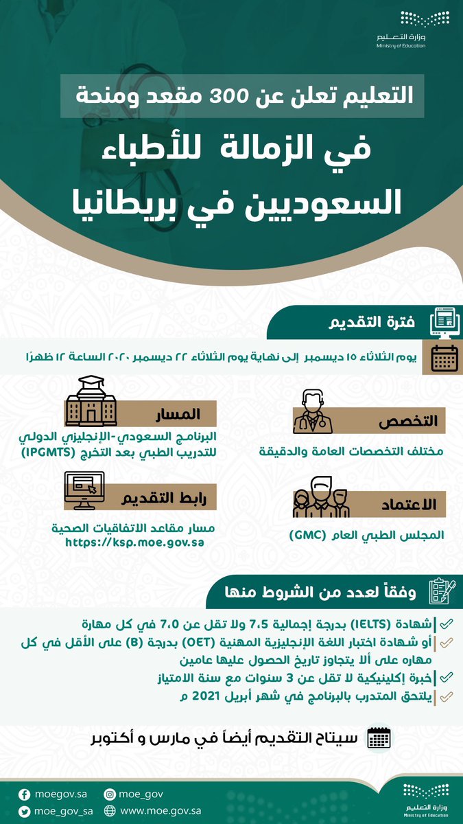 أعلنت وزارة #التعليم عن300مقعد ومنحه في الزمالة للأطباء السعوديين ببريطانيا لمختلف التخصصات العامة/الدقيقة ويبدأ التقديم عليها من يوم الغد الخميس ولاسبوعين كما سيتاح مجدداً في يوليو 2021