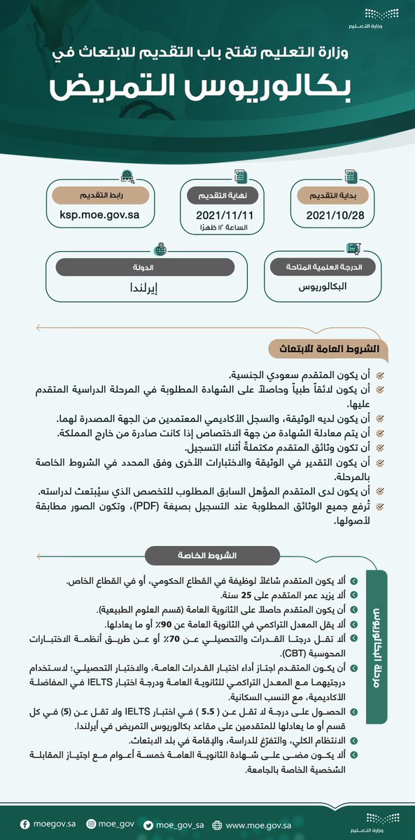 أعلنت وزارة #التعليم عن بدء استقبال طلبات الابتعاث لدراسة مرحلة #البكالوريوس بتخصص #التمريض في دولة إيرلندا 🇮🇪 ضمن مسار "الاتفاقيات الصحية" وذلك خلال الفترة من 28 أكتوبر وحتى 11 نوفمبر 2021