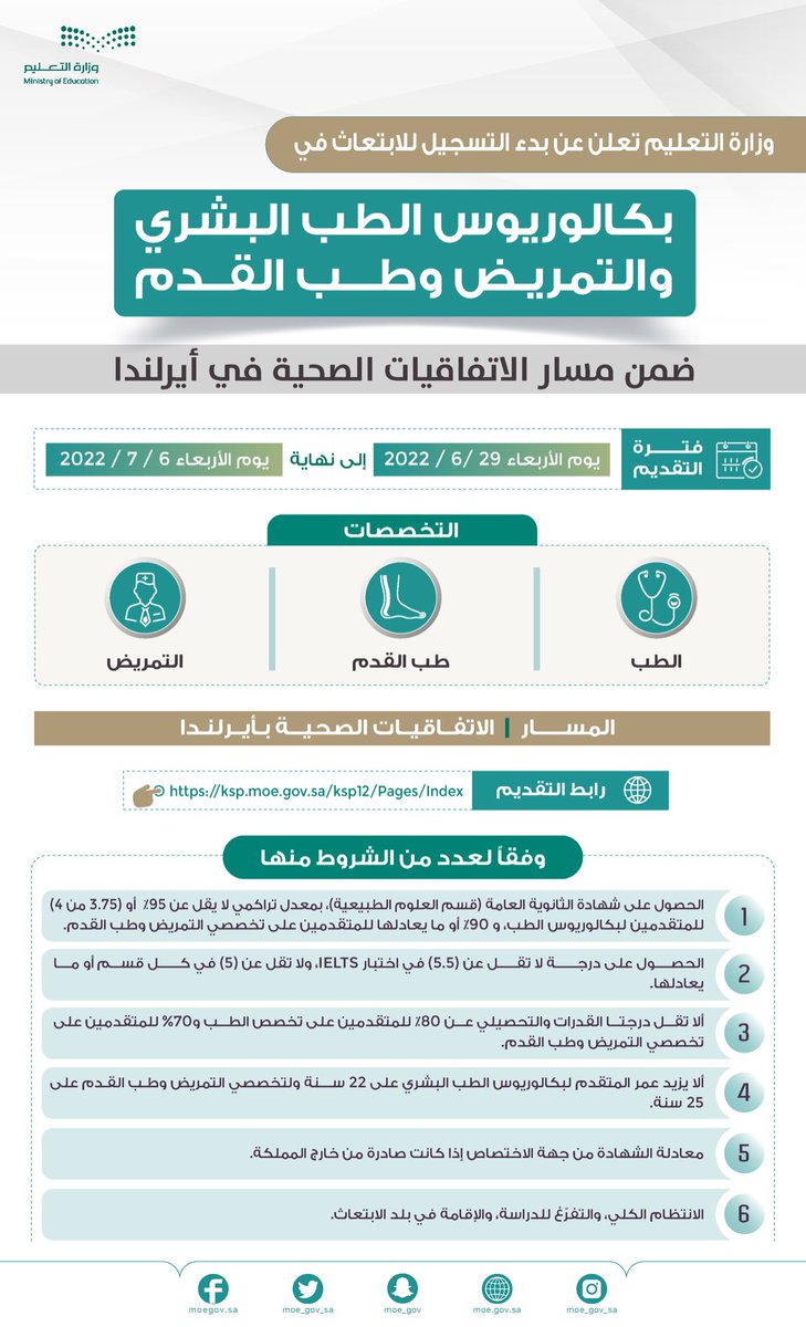 أعلنت وزارة التعليم عن بدء التسجيل للابتعاث في بكالوريوس #الطب البشري، و #التمريض، وطب القدم؛ ضمن مسار الاتفاقيات الصحية في دولة أيرلندا 🇮🇪 ويستمر التسجيل حتى يوم الاربعاء ٦ يوليو المقبل 📝