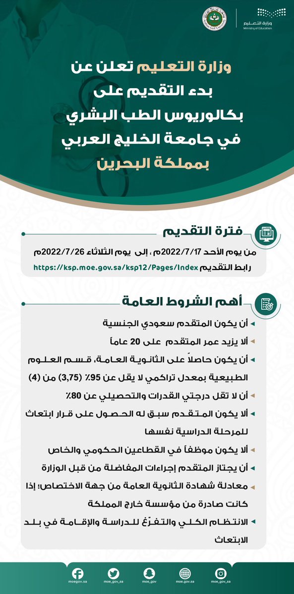 أعلنت وزارة التعليم عن بدء التقديم للراغبين بدراسة #الطب البشري في جامعة الخليج بمملكة #البحرين 🇧🇭 ويستمر التسجيل حتى الثلاثاء بعد القادم 📝