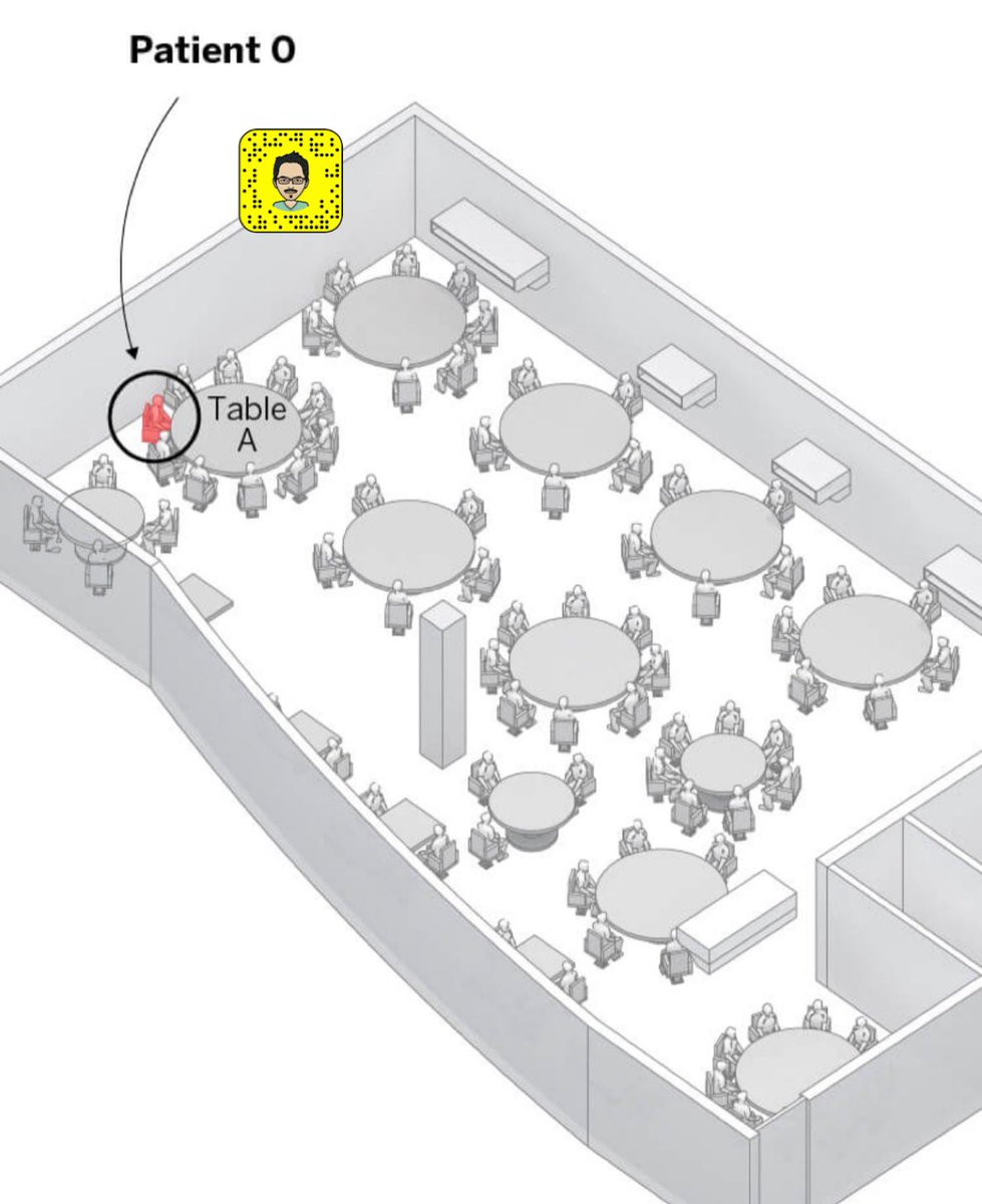 على طاولة A يجلس مصاب لايعلم انه مصاب حيث لم تظهر عليه أعراض المرض