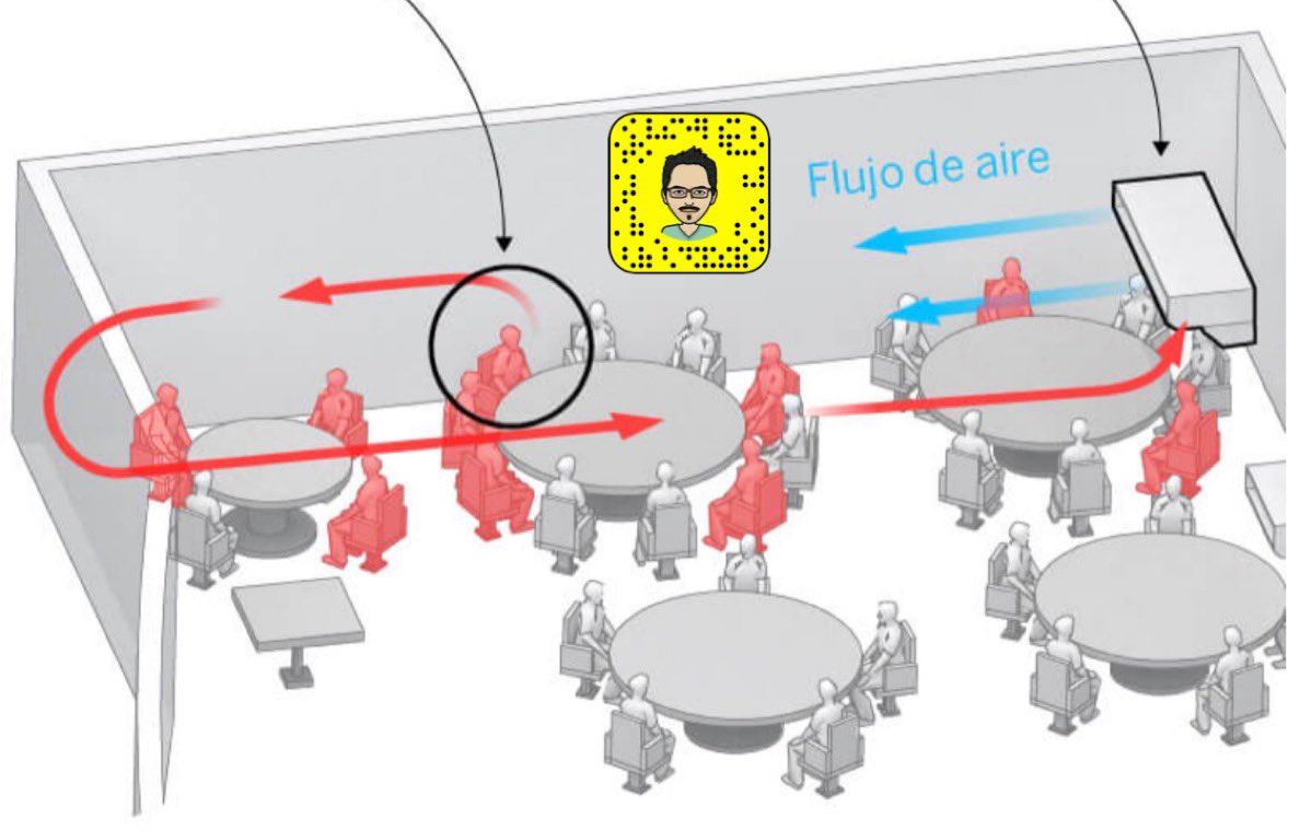 يعتقد الباحثون ان التكييف لعب دوراً مهماً في توزيع الرذاذ المحمل بالفيروس بين الطاولات 5️⃣ .. يتبع