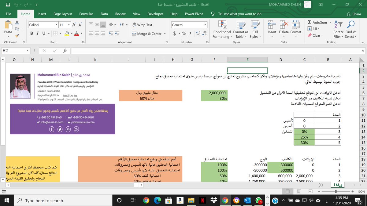 ستظهر قيمة المشروع في النموذج ويوجد شرح مع التوضيح ان هذا نموذج مبسط وليس للتقديم على جهات التمويل او شركات الاستثمار ولكن للاسترشاد