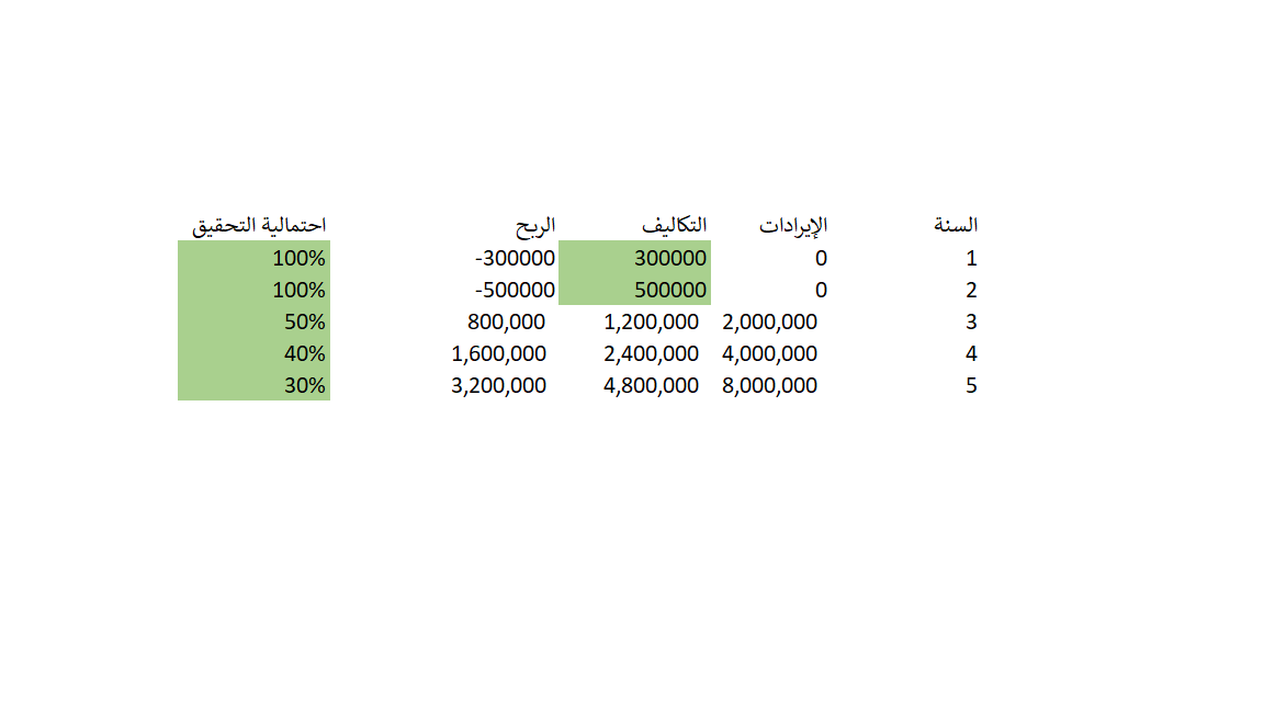 ولاحظ تأثير الربحية ونسبة النمو والتكاليف وتأخر فترة التشغيل واحتمالية التحقيق جميعها عناصر مهمة