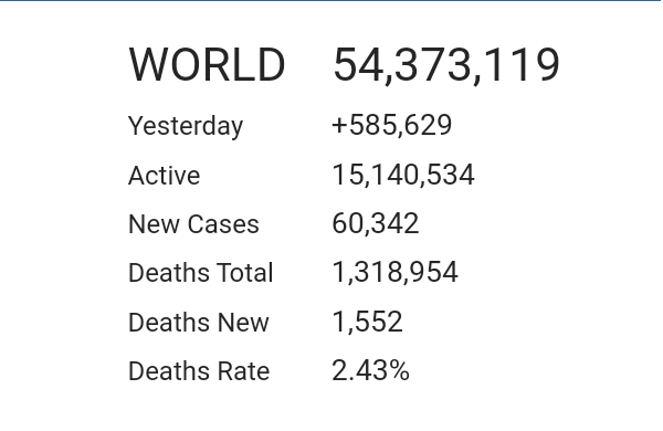 من تاريخ 14 نوفمبر وحتي تاريخ 24 ، بلغت عدد الاصابات بكورونا حول العالم ستة ملايين ونصف .